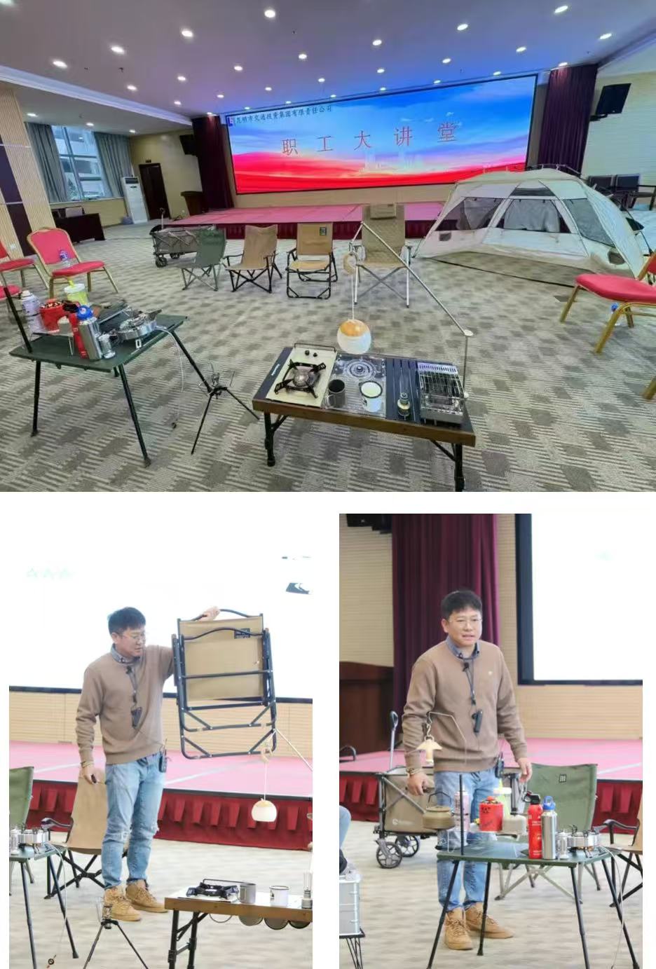 紧接着,“职工大讲堂”第一讲正式开启,主题为“露营装备知识详解”,由城市发展集团工程部经理朱杰主讲。朱杰通过创新的“展示+互动”形式,为听课者带来了一场别开生面的知识盛宴。