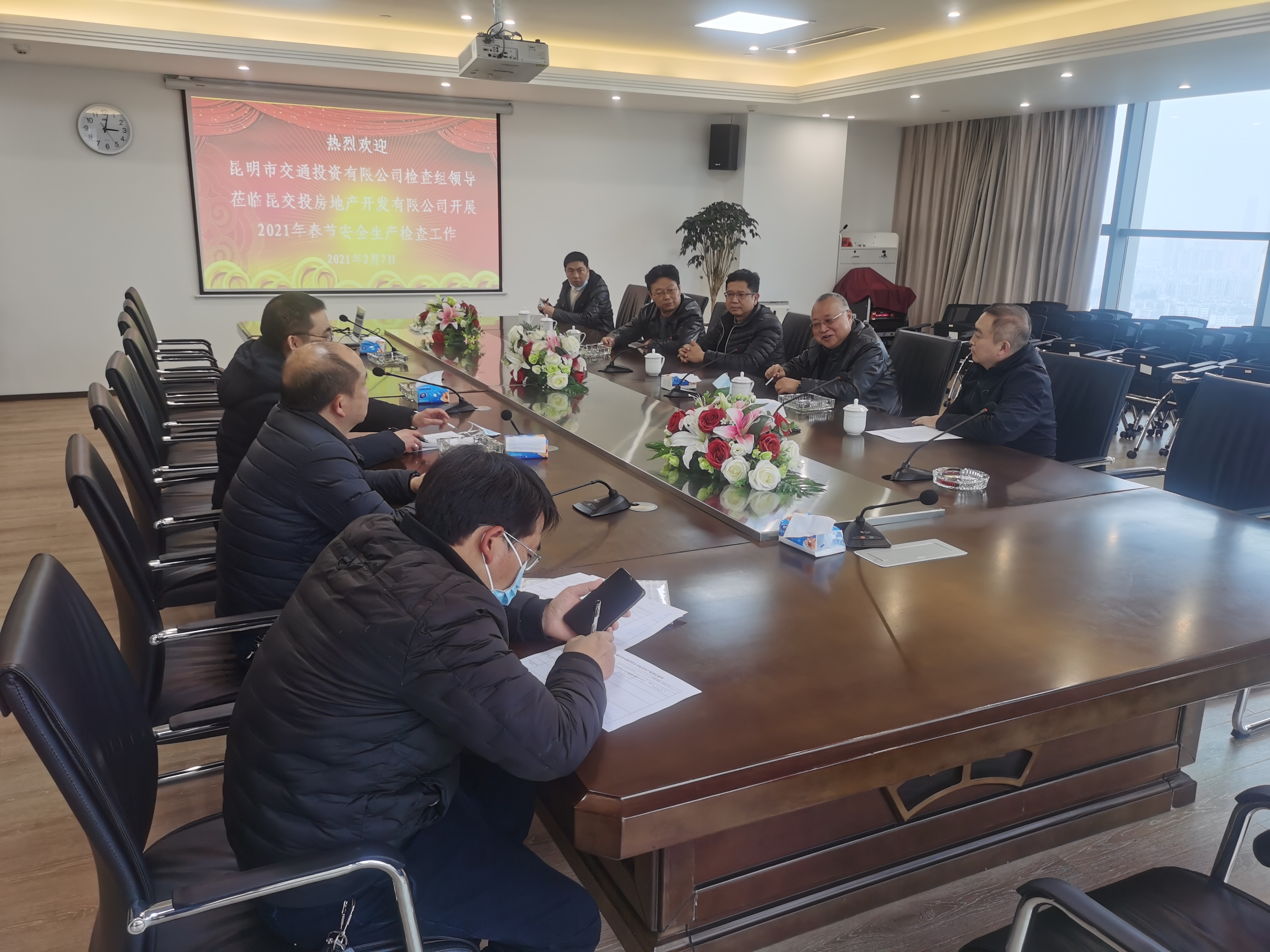 在2021年春节即将到来之际,2021年2月7日,由金沙赌场公司总经理金炜带队,到金沙赌场房地产开发有限公司(以下简称“交投地产公司”)调研并检查春节前消防安全环保工作。交投地产董事长刘玉和、总经理谢旭兵、副总经理秦云华、王庆平陪同。