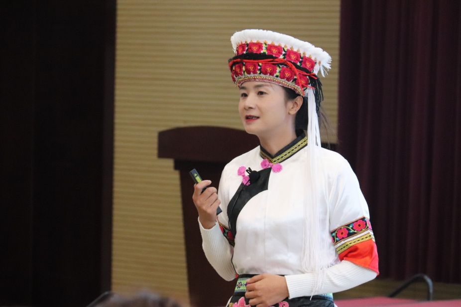 张梦凯身着大理白族传统服饰,以一句地道的白族方言问候拉开序幕。她系统介绍了白族民族起源、民居建筑、民族服饰、礼仪习俗、饮食习惯和传统节日六个方面内容。沿着历史的脉络,她从苍山洱海间振翅的“镇水之神”大鹏金翅鸟,说到“三坊一照壁”“四合五天井”的建筑美学,引出了白族的图腾崇拜与自然观;从白族服饰里流动的元素密码,谈到火塘文化中升腾的文明薪火,深入浅出地介绍了白族的丰富文化内涵。在讲座现场,张梦凯巧妙地利用身上的白族服饰,让听课者近距离感受白族服饰与头饰所蕴含的大理“风花雪月”的特色风光。她还通过提问互动,向大家揭示了白族三道茶“一苦二甜三回味”的人生哲理,让在场听众在轻松愉快的氛围中,深刻体会到白族文化的独特魅力与深邃内涵。